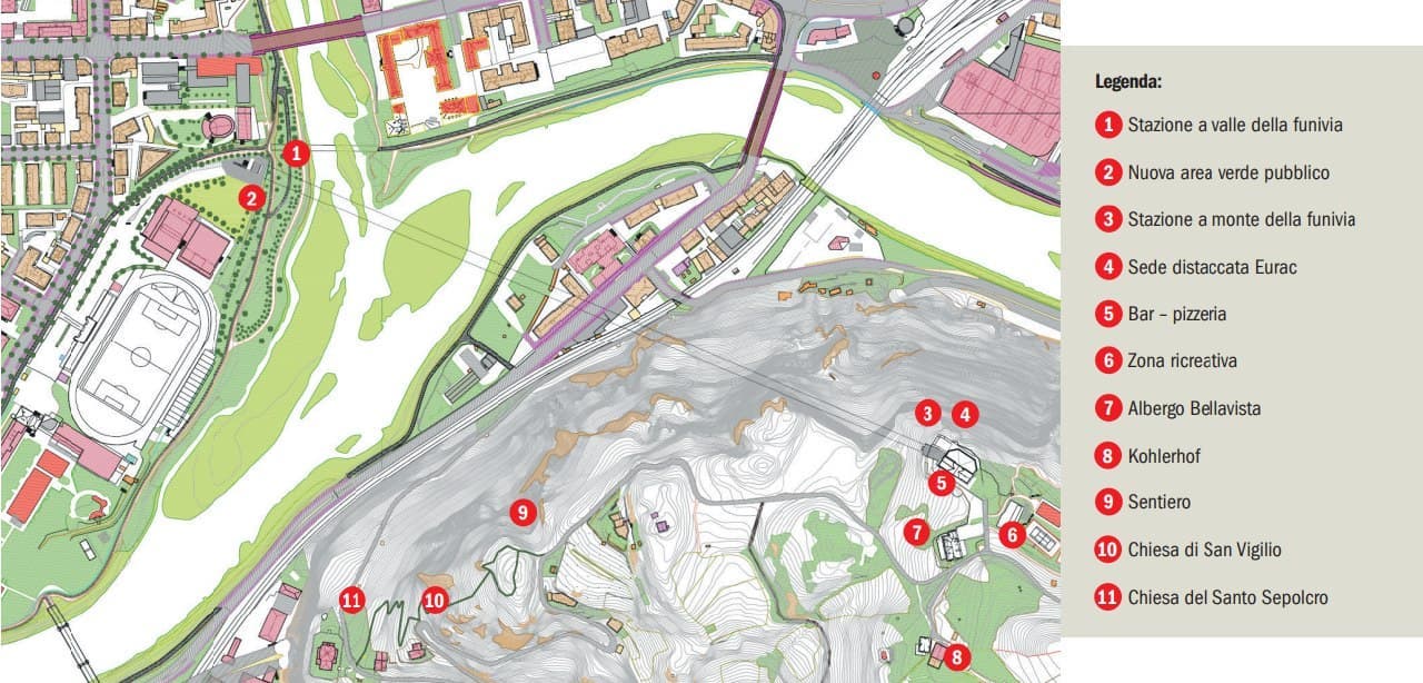 Pochi ma importanti devono essere i paletti per un progetto di riqualificazione del Virgolo: una funivia che partendo dal Drusetto – lo spazio verde accanto all’Eurac, del quale andrebbe ad occupare una piccola porzione – raggiunga il Virgolo; nuovi percorsi pedonali per raggiungere la sommità della collina, valorizzando gli aspetti naturalistici e storico-culturali; la ristrutturazione degli immobili storici esistenti, in modo da offrire un’adeguata offerta in termini di ristorazione ai frequentatori del piacevole parco da realizzare; infine la possibilità di prevedere spazi per le istituzioni culturali, universitarie e/o di ricerca della città“.