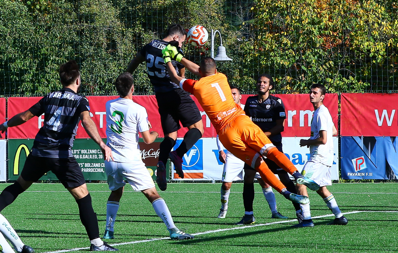 Il gol del vantaggio biancorosso è arrivato al 24”. Cia semina il panico nell’area di rigore avversaria, tamponato in angolo ed all’ultimo istante da N’ze. Dalla bandierina lo stesso Cia traccia la lunga gittata che trovato pronto Rizzon a svettare ed insaccare di testa. Il Caldiero accusa il colpo e stenta a reagire. Il primo colpo alla porta della Virtus Bolzano arriva al 31’ quando l’angolo insidioso battuto da Burato, costringe Grbic a sorvolare le maglie dell’’area intasata e respingere con i pugni, allontanando la possibile minaccia.