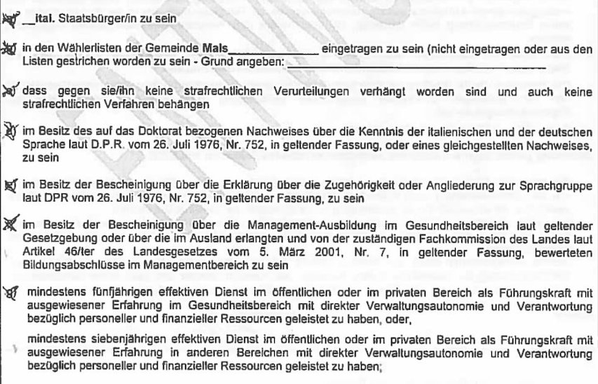 Esistono invece le indagini preliminari avviate dalla Procura di Bolzano su due diversi fronti: il primo, volto ad accertare eventuali irregolarità sulla nomina a direttore generale dell’azienda sanitaria dell’Alto Adige, punta sulle modalità di compilazione di un modulo di autocertificazione nel quale si richiedeva di dichiarare il possesso dell’attestato di un corso di management in campo sanitario (punto 6, casella barrata che equivale a una risposta positiva).